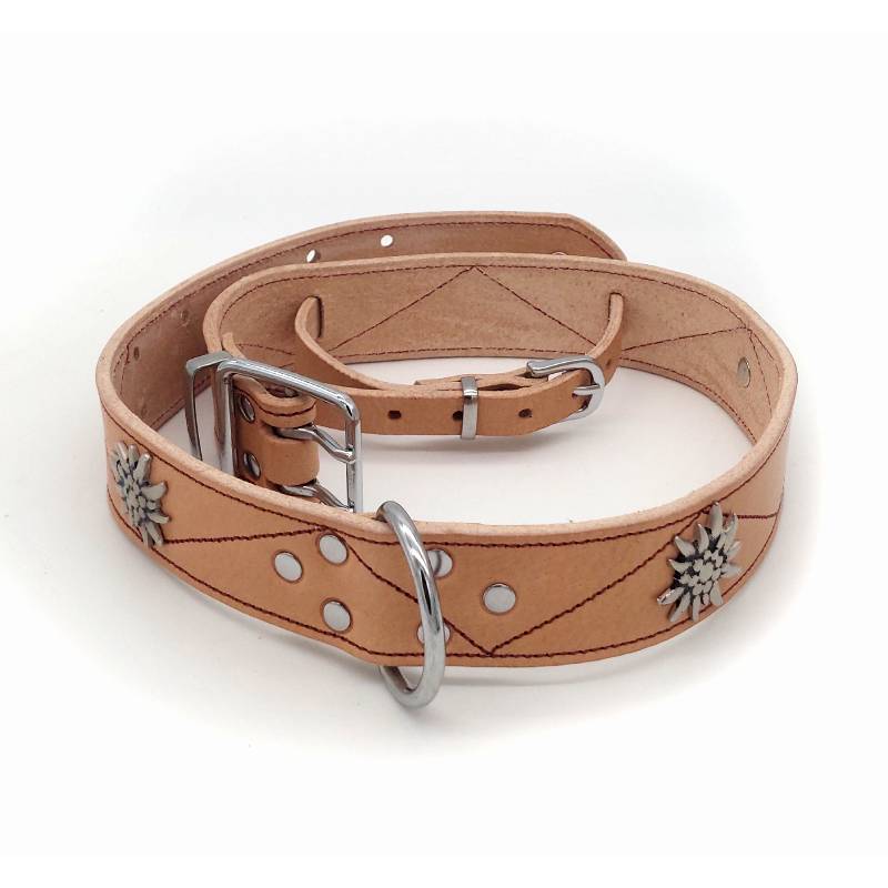 De lederen halsband met metalen edelweiss ornamenten is van hoge kwaliteit en is speciaal ontworpen voor de comfortabele bevestiging van het tonnetje.