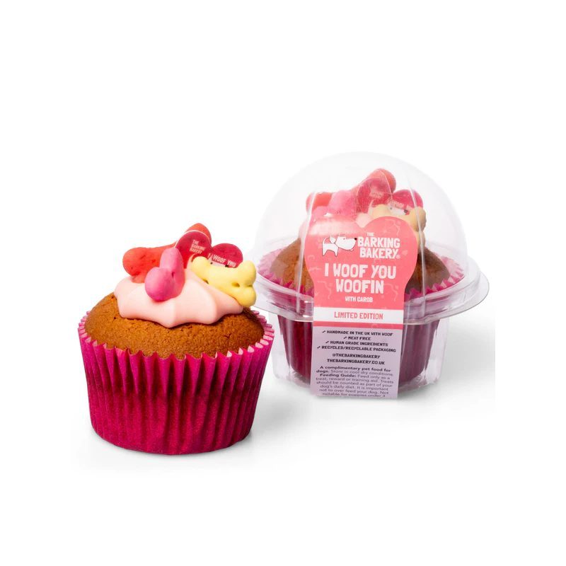 Een enkele Pink Topped Carob Woofin 70 gr. Gemaakt om te delen of voor onze grotere harige vrienden. Een luchtige sponscake, bedekt met een staartzwiepende swirl van beroemde yoghurtglazuur en versierd met een knapperig botje en hartvormig koekje. De Woofin is afgewerkt met een eetbaar hartvormig schijfje in een mooi muffinvormpje. De kleur van het decoratieve botje kan variëren.